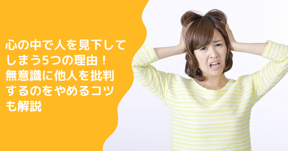 「人をナチュラルに見下してしまう癖がある」「心の中で悪口を言ってしまい、ストレスがたまる」 「無意識に見下してしまうのをやめる方法を知りたい」 心の中で人の悪口を言うのはやめたほうがいいと分かっていてもやめられず、悩む人は多いものです。しかし、無意識の見下しは、やり方次第で減らせます。 そこで、この記事では、ナチュラル見下しをやめたい人に向けて以下の内容を解説します。 ナチュラルに人を見下す人とは 無意識に心の中で悪口を言う人の特徴 対処法 注意点 ナチュラルに人を見下すことをやめるヒントが得られるので、 ...